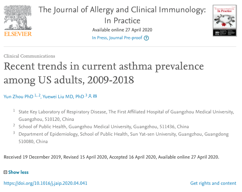 2020年4月27日,免疫学领域国际著名杂志The Journal of Allergy and Clinical Immunology: In Practice(影响因子7.6)在线发表了公卫澳门金沙app 周芸教授的短篇报道Recent trends in current asthma prevalence among US adults, 2009-2018。该研究通过分析2009至2018年的美国国家健康与营养调查(NHANES, National Health and Nutrition Examination Survey)数据,计算了近十年美国成人哮喘现患率及变化趋势。研究显示,2009-2014年间美国成人哮喘现患率逐渐上升,而从2015年起趋于稳定,2017-2018年间发病率达8.9%。该研究结果提示了重视成人哮喘防控的重要性。