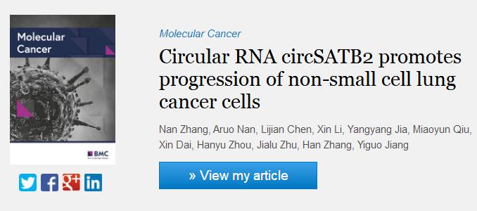 2020年6月3日,著名杂志Molecular Cancer以长篇文章形式,在线发表了澳门金沙app 研究生张楠研究论文“Circular RNA circSATB2 promotes progression of non-small cell lung cancer cells”。论文第一作者张楠为澳门金沙app 2018级博士研究生,通讯作者为导师蒋义国教授。Molecular Cancer是国际肿瘤学一区杂志,影响因子10.6。这是蒋义国教授课题组自2019年以来,发表的第3篇10分以上高水平杂志论文。